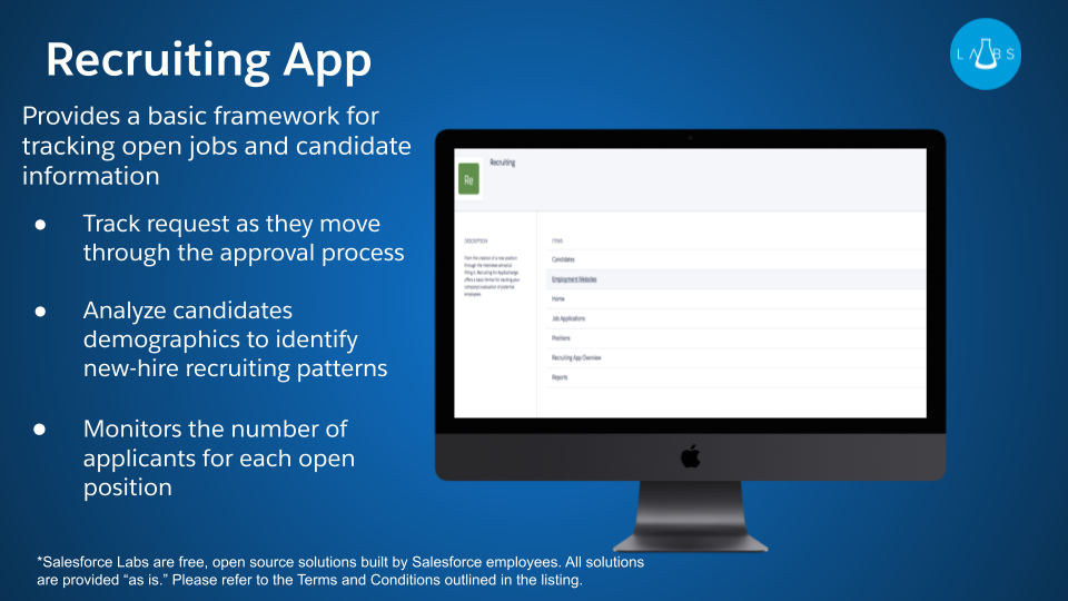 App Recruiting Manager App by Salesforce Labs Free Features. Customize an app using clicks not code to give your recruiters easy access to key data.
